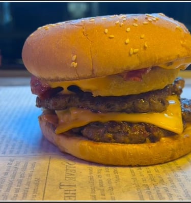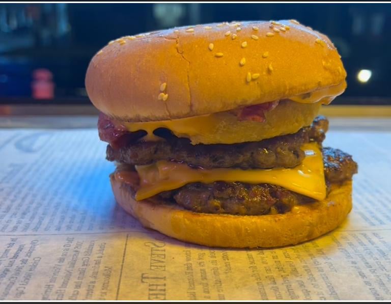 Gourmat beef patties with beef rashers, crispy onion ring, cabra special sauce on a bun.