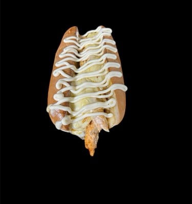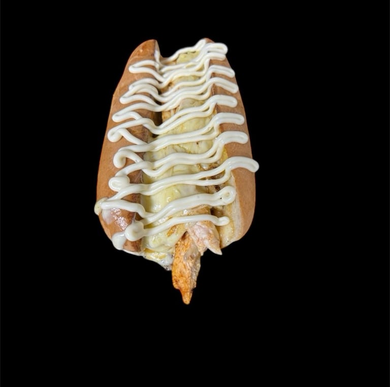 Hot dog topped with beef bolognese, cheese, mayo and hot chilli.